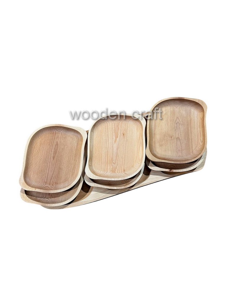 Aceste platouri dreptunghiulare din lemn de fag, cu colțuri rotunjite și finisaj natural, sunt concepute pentru a aduce simplitate și eleganță fiecărei mese. Setul conține farfurii individuale și un platou lung cu trei compartimente – ideal pentru servirea gustărilor, aperitivelor sau combinații creative de alimente.